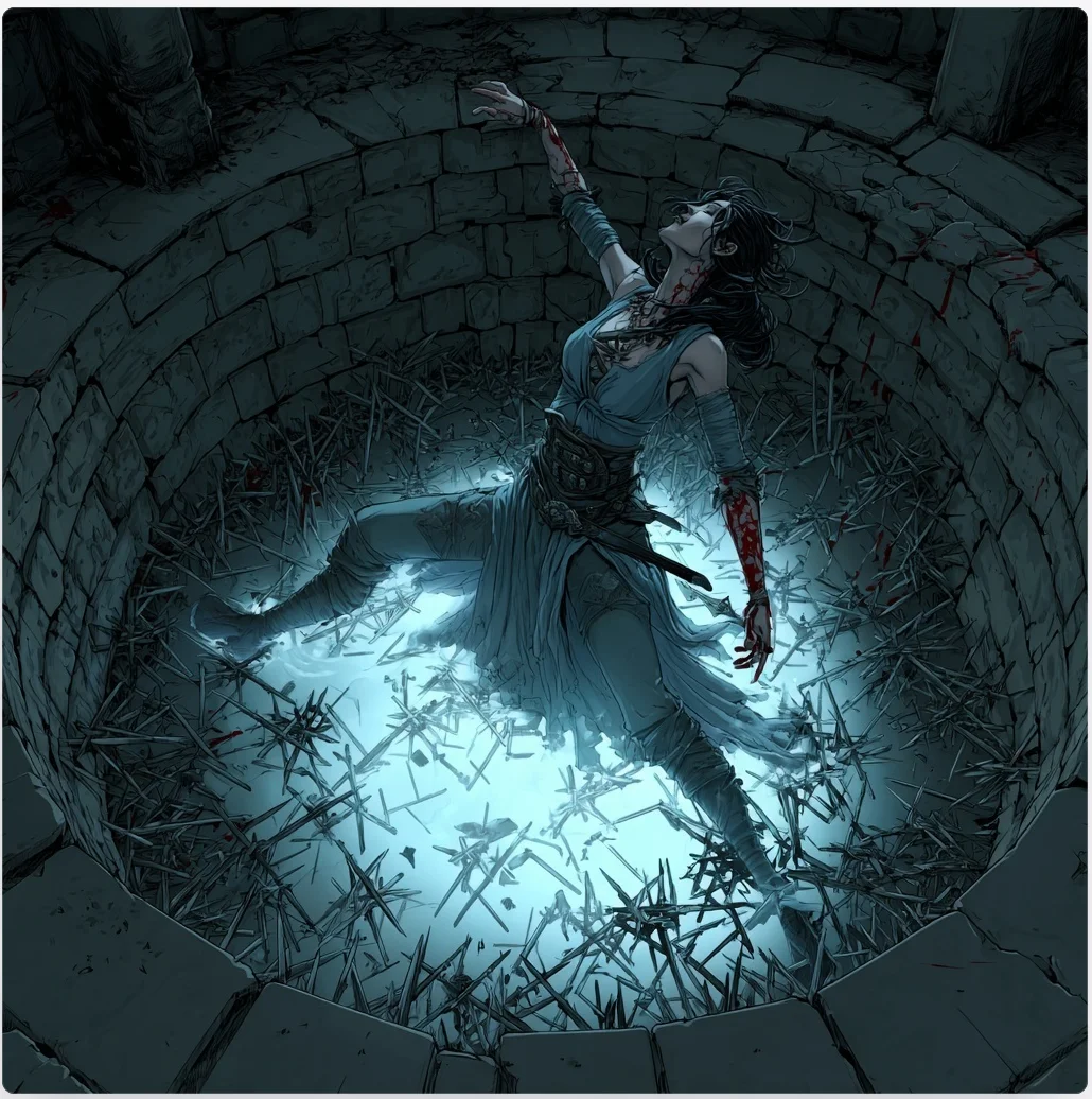 Bruzra was not so fortunate. She plummeted into the pit with a cry of alarm, her fall ending with a wet, terrible sound as the iron spikes at the bottom found their mark. Blood pooled around the cruel points that had pierced her body, and for a heart-stopping moment, she lay motionless in the darkness below. Druidly immediately sprang into action, securing a rope around his waist while Bancroft and Delpha braced themselves to lower him into the deadly pit.