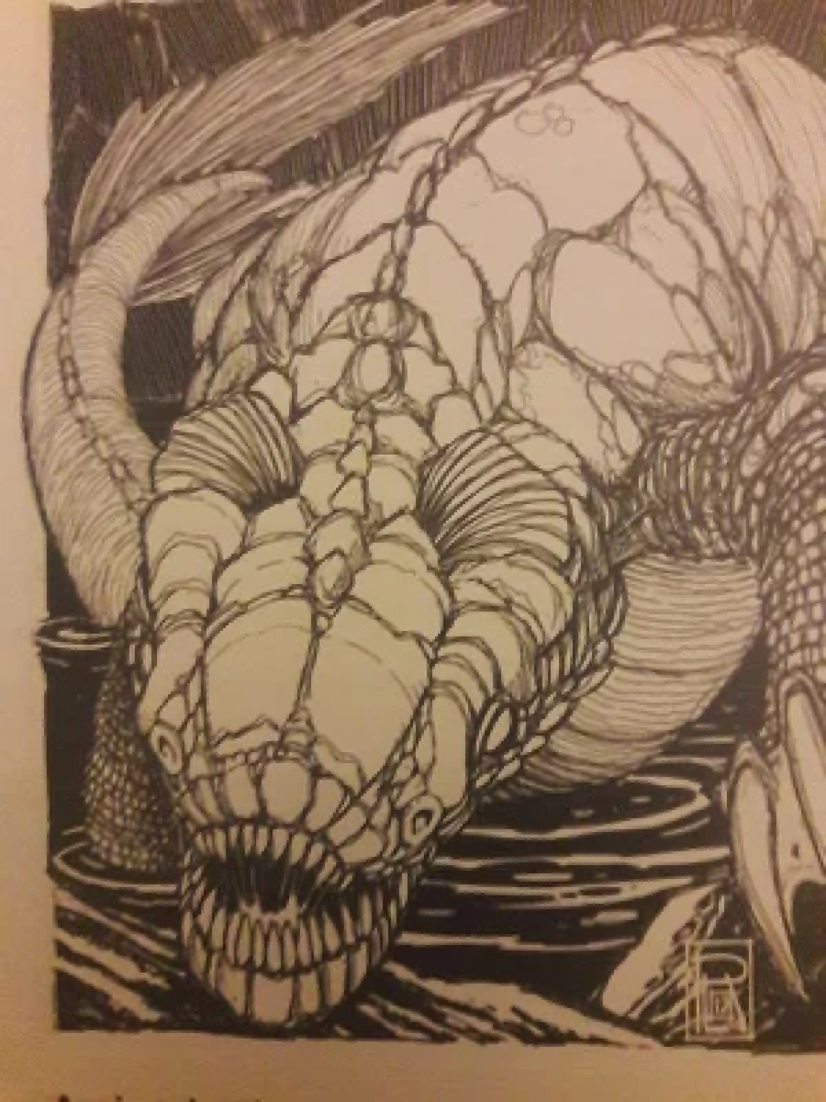 They tossed the rope, hook on one end, bait (frog bits) on the hook, down into the corridor and dragged it back while Leah imitated frog mating calls. Before long the rope went taught! The party arranged themselves into an ambush position with missile weapons and prepared to receive the mudtiger. As the beast was dragged into the room and Leah’s arrows began to take their toll, Pyro suddenly yelped as if something had struck him – and the sound of claws in wet sand came from behind Leah. Something was charging the party! Leah got a shot off – but the creature, reeking of death, clawed her in return. The horrid stench at such close range paralyzed the ranger in place, with Pyro behind her to avoid her arrows and thus unable to protect her from the claws and teeth of the undead.
