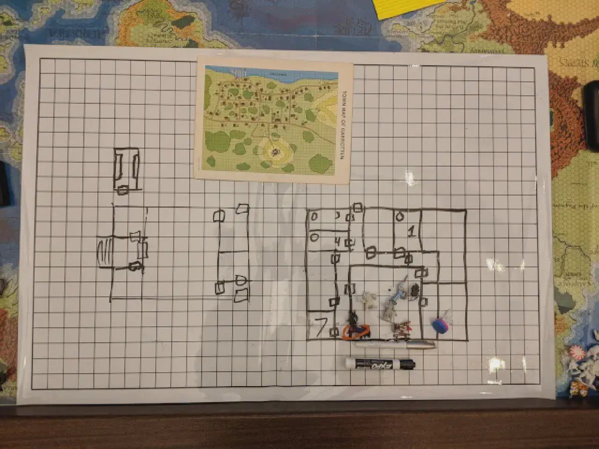 Speaking of Tiberium and Warin, they had followed an acolyte of Osphrem back to the temple, where Harper had ordered an octopus for his lunch. Tiberium gently interrogated the old man, learning that he didn’t travel much, was capable of powerful spells, claimed no grudge against the duke, and appeared to be going mildly senile. Also, when his octopus arrived cold, he had it placed on a birdbath visible from his window, and called down a Flame Strike to warm it. Harper offered to memorize a spell that might help with the hammer, and set the price by spinning four wheels of chance set into the walls of his quarters. Tiberium promised to come back later if they needed a spell.